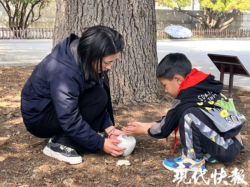 临行前,尤婷婷和儿子在青山翠柏间取了一抔土,小心翼翼装进随身携带的洁白瓷罐,带回家乡。