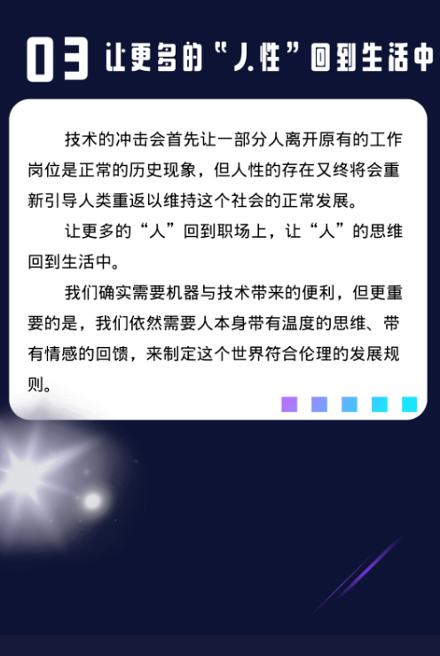 在校园里,我们的学习除了对标在某一项实际技术的获得,更应该注重在创新与理性思维的培养上,学会正确看待人类与AI 的共生关系,设定好人类和技术的边界。让自己更多的“人性”潜能发挥出来。