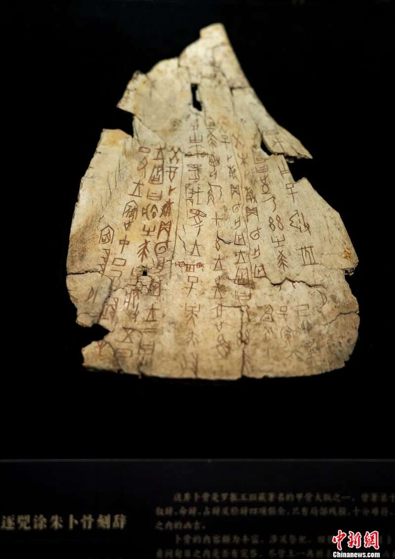 位于北京的国家博物馆内的“证古泽今——甲骨文文化展”展出的“王宾中丁·王往逐兕涂朱卜骨刻辞”卜骨。侯宇 摄