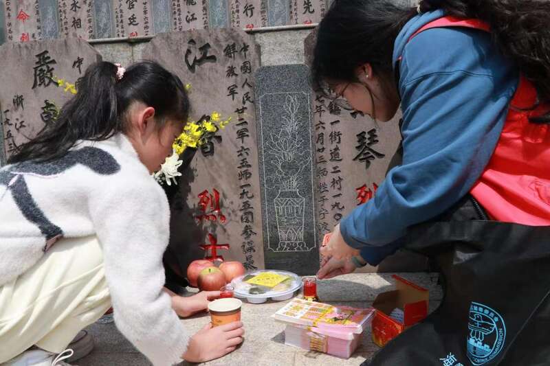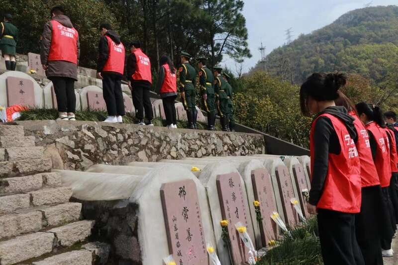 仪式结束后,同学们分散立于烈士墓碑前为烈士献上手中的鲜花,并蹲于碑前为墓碑拭去尘土、清除杂物。孙嘉怿现场还讲述大榭岛上独特的红色印记,非宁波籍烈士二十二军洛阳营营长林茂成带领营队浴血奋战、解放舟山,最终永远长眠于山清水秀的芦江河畔的激壮事迹。