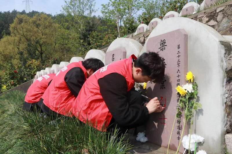 之后,同学们蹲跪于墓碑前,手持毛笔为碑上隐现的“烈士”进行描摹,一笔一画留下传承的红色印记。孙嘉怿说:“墓群中至今还存在着许多写着‘革命烈士’的无名碑,他们牺牲前也未曾留有姓名与家乡,他们的烈属至今还在寻找他们,至今无法认证他们烈属的身份。”
