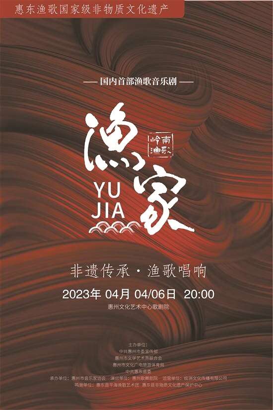 4月4日、6日晚,大型渔歌音乐剧《渔家》在惠州文化艺术中心开启首轮公演,反响热烈。该剧是全国首部以国家级非物质文化遗产惠东渔歌为基础的音乐剧,时长近110分钟,取材于惠东渔村的疍家故事,以女主角秋雁与男主角向岸的爱情为纽带,描绘渔民的命运流转。