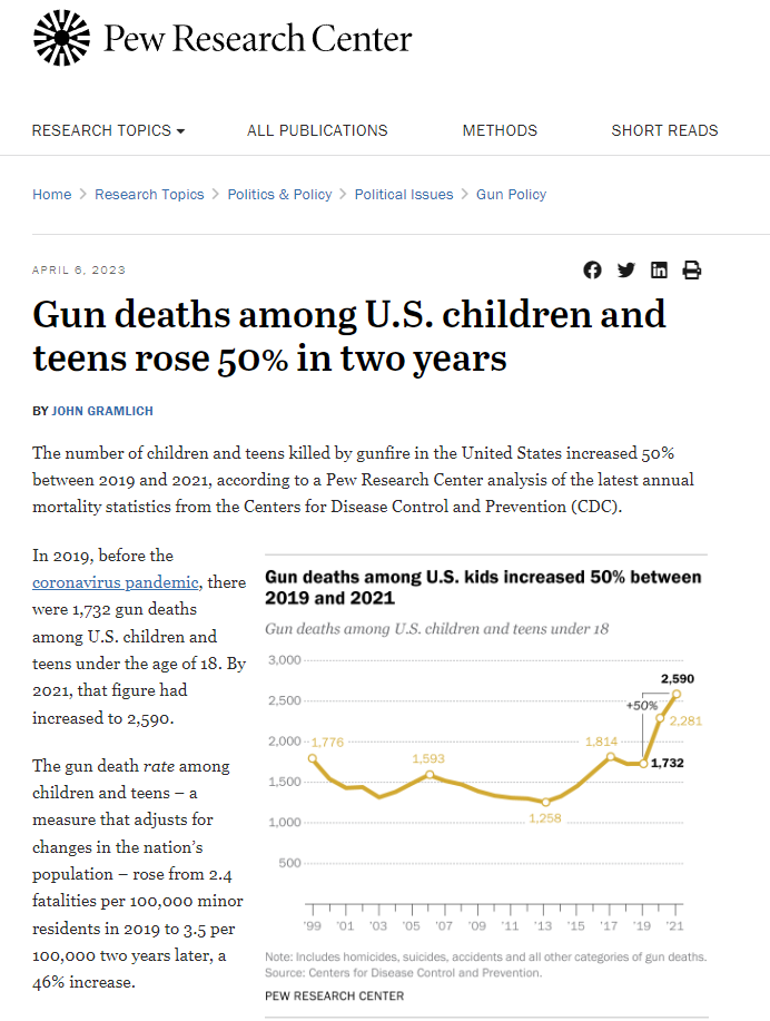 依照皮尤研究中心说法,2021年美国儿童和青少年死亡人数及枪击死亡率至少是1999年以来最高值。