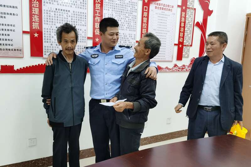 4月5日20时许,平孟出入境边防检查站移民管理警察在对口岸限定区域巡逻时,发现一名男子进入到口岸限定区域,便走近询问了解情况,发现其精神状态不太好,语言表达也存在一定问题,一时无法了解他的姓名和具体情况,便将他带到口岸大楼接待室做进一步了解。经过耐心询问交流,这名男子表示,自己是广东省河源市龙川县紫市镇新南村人,30年前离开了家乡。根据该男子提供的线索,民警经网络查询、求助相关部门等,最终联系到了该男子提到的新南村支书,初步确认该男子是该村村民杨桂明的弟弟杨静民。