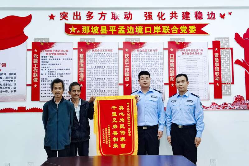 杨桂明(左二)向民警送上“真心为民传家会 千里兄弟喜相聚”的锦旗。 平孟出入境边防检查站供图