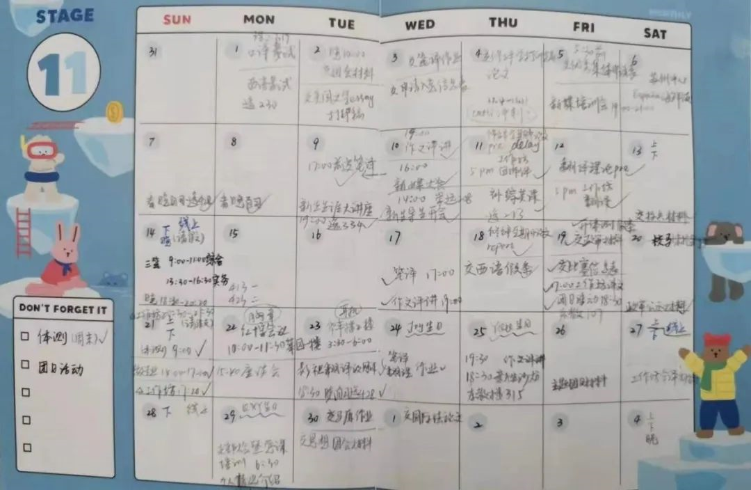 陈青乔认为时间管理既要有大局观也需细化。每学期结束后,她会进行阶段性总结并对新学期想要完成的事项做一份梳理。每月,她会在计划本上罗列当月要做的事项,把重要的事情交错安排,提前留足时间。每一天也是如此,当天的安排在开始做事之前心中已做好打算。