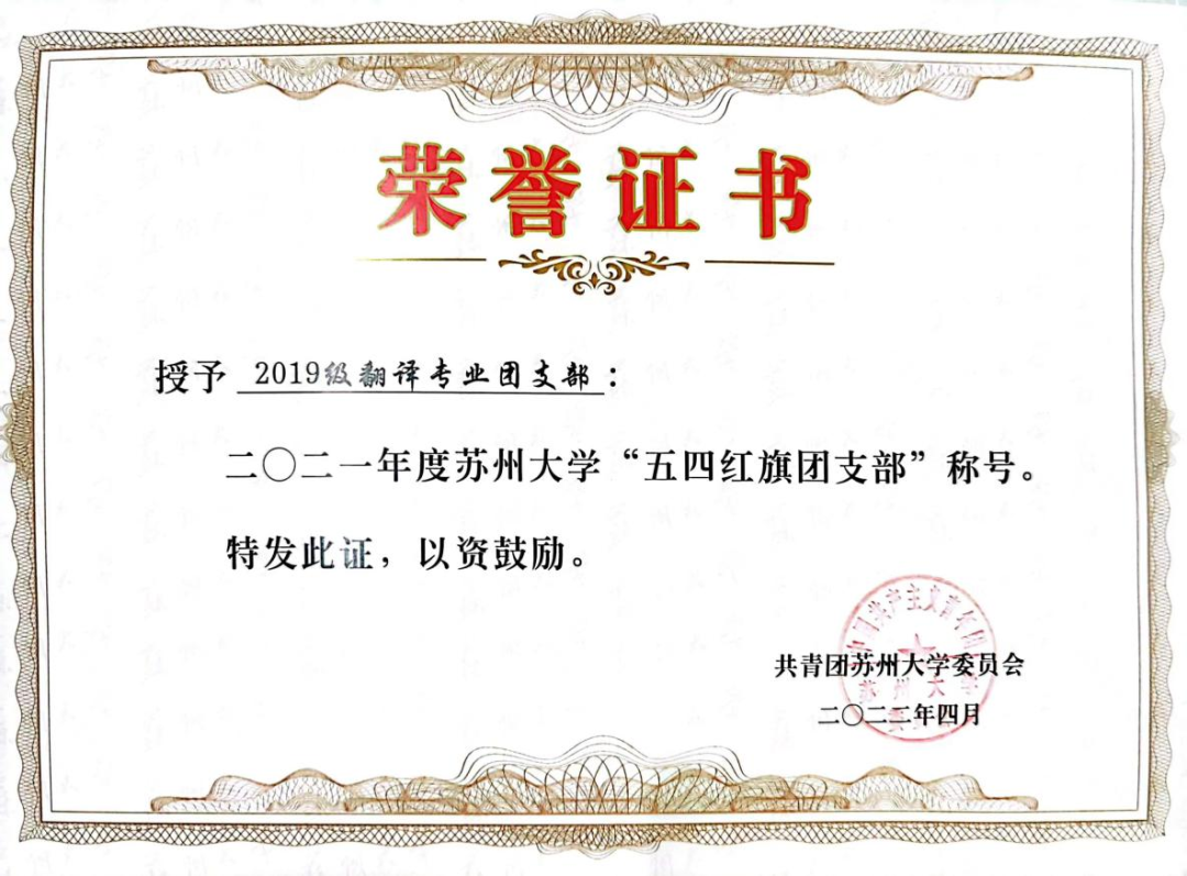 在支部成员的共同努力下,2019级翻译专业团支部荣获2021年度苏州大学“五四红旗团支部”称号,陈青乔也获评2021年度苏州大学优秀团支部书记。