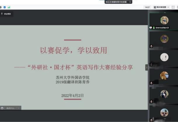 当谈到参赛的心得,陈青乔说:“一是要大胆尝试,不畏失败,抱着锻炼自我、学习成长的心态。二是善于学习,如向老师、前辈、同学请教,向竞赛选手学习,博采众长为我所用;三是融会贯通,化用课内外学习过的材料,赏析优秀范文等等。”陈青乔认为自己从过往获奖的学姐学 长分享中学到了干货、受到了鼓舞,赛后也将自己的心得感悟加以总结提炼,分享给学弟学妹们将经验传承。