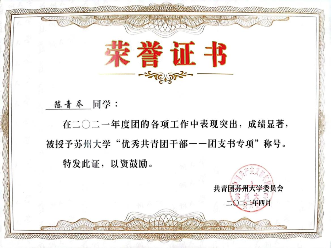 2022年4月,2021年度苏州大学“五四红旗团支部”称号、“优秀共青团干部——团支书专项”称号;
