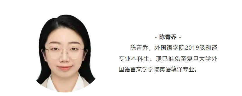 当问到在学习上有何心得的时候,陈青乔坦言“我觉得自己是属于比较踏实的人。做一件事情会想要尽自己的能力做到最好,看重过程中的付出。”面对专业课程,她毫不懈怠,孜孜以求,不仅保质保量地完成课程任务,更大量阅读,勤思勤问,力求以“笨功夫”锻造听说读写的“金本事”。专业课外,她选修了文艺、史哲、社会科学、科技与发展等不同类别的通识选修课和具有挑战性的新生研讨课,在不同学科的知识海洋中遨游。努力不会说谎:入校以来,她的成绩始终稳居专业第一,连续三年获得外国语学院“院长荣誉奖”,并在本科三年级荣获国家奖学金。
