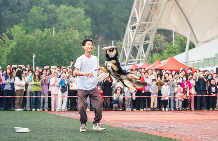 在飞盘表演中表现出色的狗狗“子龙”,年龄仅仅一岁。“我和子龙磨合了有一年多,其实一岁的小狗还没有到表演飞盘的年龄。”主人柏全使劲揉了揉小狗的脑袋,骄傲地说道,“但这次表演它完成得非常出色,临场发挥得十分机敏。”