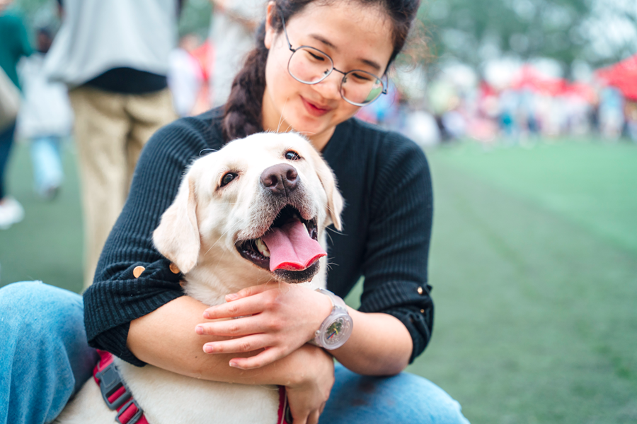 华农网红视频博主“小米的狗”、2021级兽医专业硕士研究生郭同学此次也携爱宠拉布拉多犬“小千金”前来参加活动。采访过程中,“小千金”正与周围的狗兴致勃勃地玩闹,性格和主人视频里一样活泼。据郭同学介绍,自己是走读生,平时把狗狗养在校外住处,不时也会带狗狗到学校来玩耍,“我们家‘小千金’可以说是华农医生看着长大的狗!”