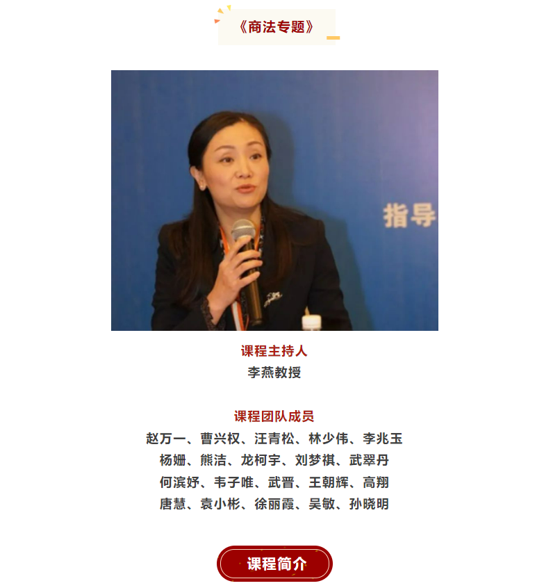 该课程以引导法律硕士研究生就商法主要问题进行理论分析和实践考察,掌握商法有关原理、制度的理论框架、规范结构和实践情况为建设目标,通过体系化的专题设置,多师同堂的沙龙式研讨,以及“课前、课中、课后”的一体化教学衔接,培养法律硕士的商法思维能力以及分析、研究商法基本原理、基本制度以及解决相关实际问题的能力。