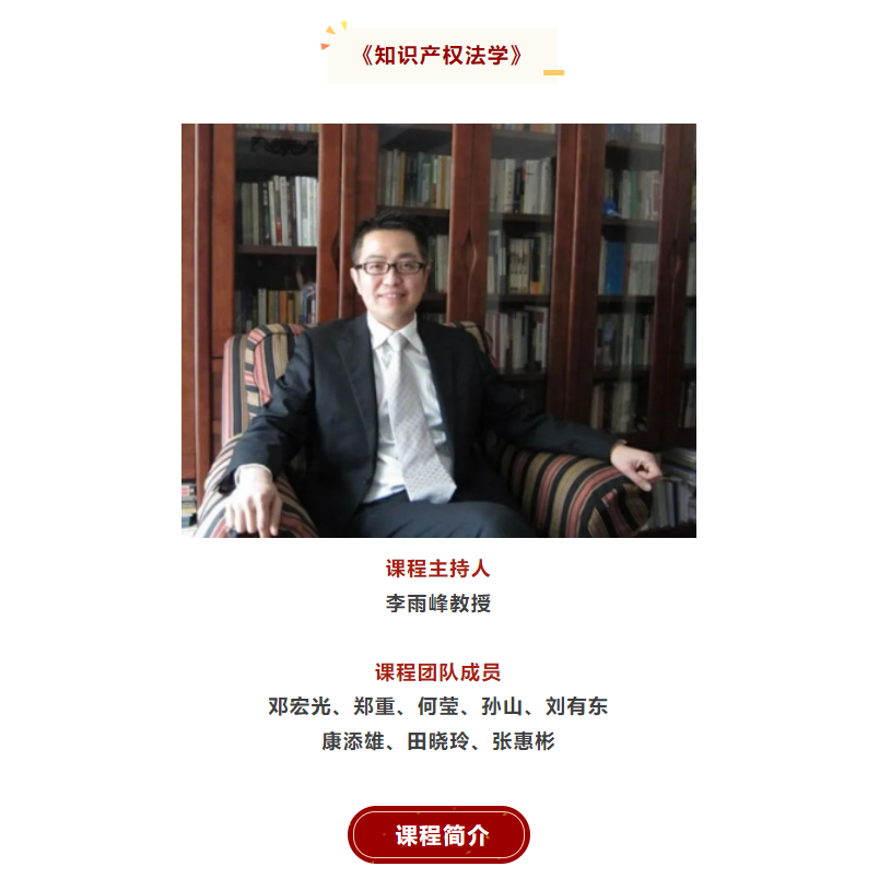 该课程旨在向学生介绍知识产权法基础理论、法律实务以及前沿问题和最新动态。通过在知识产权法学知识的传授过程中有机融入政治认同、家国情怀、文化素养、宪法法治意识、道德修养等思政元素,强化育人理念,构建“价值引领、能力培养、知识传授”三位一体的教学目标,与思想政治理论课同向同行,形成协同效应和育人合力。