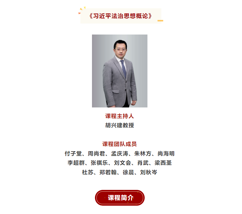 本课程将习近平法治思想作为一个内涵丰富、论述深刻、逻辑严密、系统完备的理论体系,做到讲清楚以下六个方面的内容:习近平法治思想的鲜明特色、重大意义、丰富内涵、核心要义、科学方法、实践要求。课程以习近平法治思想为指南,引导学生坚持在法治轨道上推进国家治理体系和治理能力现代化的高度去学习法律知识。