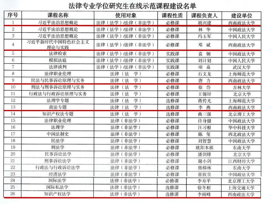 据悉,2023年初,为深入贯彻习近平总书记对研究生教育工作的重要指示精神,落实立德树人的根本任务,加强法律专业学位研究生课程建设,加快教育数字化转型,推动优质课程资源共享,全国法律专业学位研究生教育指导委员会在全国各法律硕士培养单位开展法律专业学位研究生在线示范课程申报工作,建设面向《法律硕士专业学位研究生指导性培养方案》中设置的课程,法本法硕18门,非法本法硕24门,4门实践教学与训练课法本法硕和非法本法硕可共享使用 ,共计38门课程。