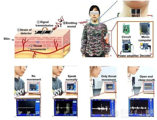 当佩戴者低吟时,石墨烯人工喉会感知喉咙的振动状态,提取关键声学特征,通过人工智能模型进行音频信号处理,来合成流畅、自然的语音,实现了动作发声系统。