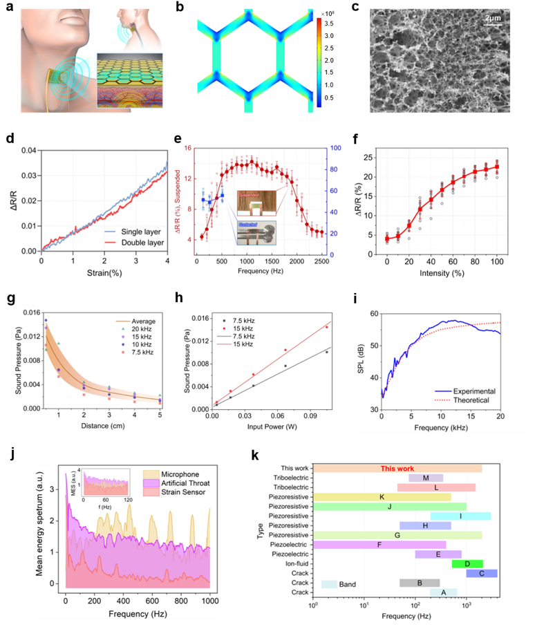石墨烯是从石墨材料中剥离出来、由碳原子组成的只有一层原子厚度的二维晶体,具有极高的电子迁移率、优秀的机械强度、优秀的导热性,对低频的肌肉运动、中频食管振动和高频声波信息有很高的灵敏度,同时也具有抗噪声的语音感知能力。