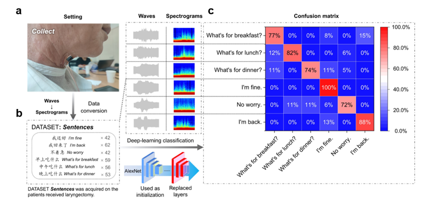 据了解,新一代石墨烯人工喉可以基本恢复患者的语言交流能力,识别一名喉切除术患者模糊说出的日常词汇,准确率超过90%。甚至不同频率的耳语,尖叫和咳嗽都可以被该设备记录,编码,并进行分类,“解码”出不同种类的聋哑人“语言”,经过训练后,有望实现“吟诗作唱”的梦想。