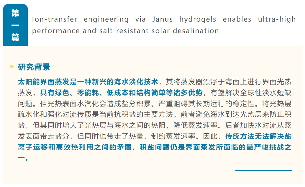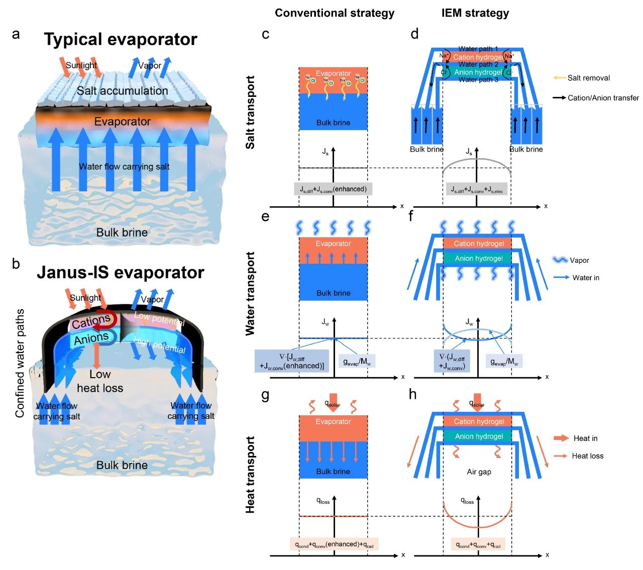 电鳗体内数以千计的肌肉细胞形成层叠排列的离子传输通道,受外界刺激后迅速响应并形成精准高效的Na+和K+可识别离子通路。该团队借鉴电鳗肌肉异质细胞间内建电场的原理,提出了通过操控阴阳离子反向传递,从而形成内部电场来驱动离子运移的排盐模式。通过模仿电鳗细胞结构,设计并构建了由Janus离子选择性水凝胶和受限水路组成的层叠结构,在蒸发器内巧妙构造了可识别性离子通道,实现了Na+和Cl-反向传递,从而形成内建电场。电场力又会加速盐离子运移,显著提高移盐能力。与传统方法不同,该方法摆脱了移盐对对流的依赖,避免了因强化对流而造成的热损失,获得了高达6.8 kg m-2h-1的创纪录的蒸发速率,是大多数抗积盐蒸发器的2倍以上,突破了界面蒸发领域的性能瓶颈。该工作开辟了一条全新的抗积盐途径,为设计下一代高效、长期稳定的太阳能界面蒸发器提供了全新思路。