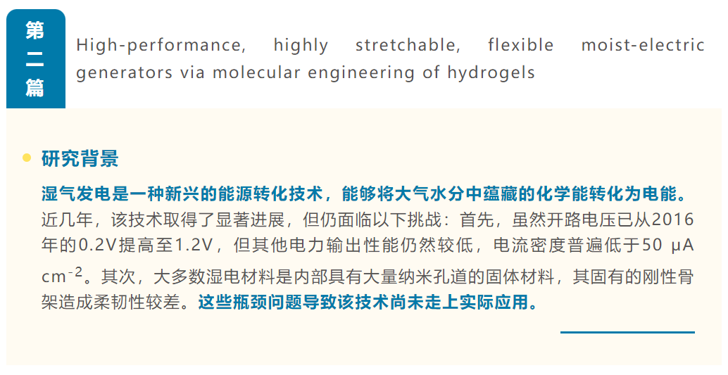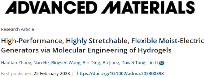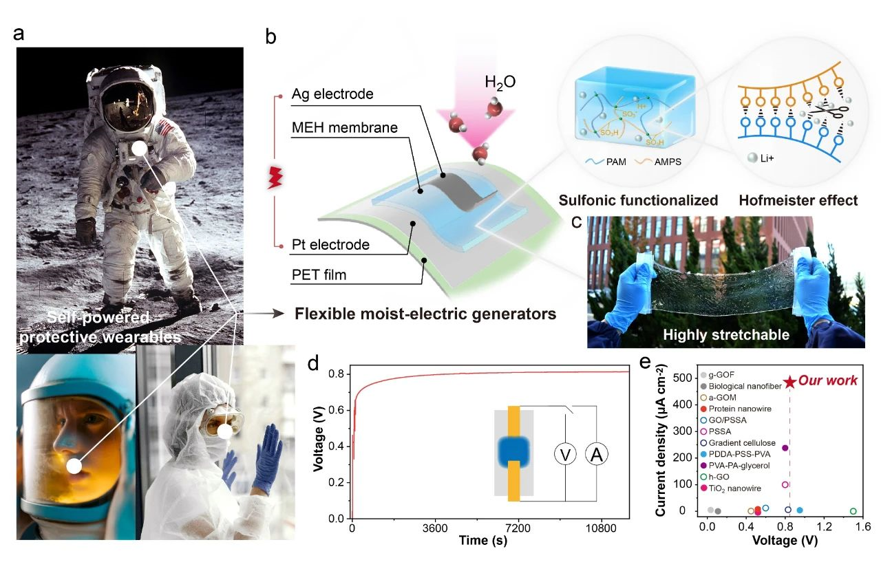为解决上述问题,该团队聚焦于水凝胶聚合物材料,其不仅拥有良好的柔韧性,而且内部具有大量的微纳结构和官能团,可吸附并储存大量水分。然而,这种柔性材料的离子传导率较差,难以直接用于湿电转化。为此,该团队提出了一种水凝胶分子工程策略,通过在其单个聚合链分子结构上进行微观设计,显著提高了水凝胶的离子传导特性和可拉伸性。该分子工程策略是将磺酸基团和锂离子嵌入到聚合链分子结构中。其中,磺酸基团赋予聚合链更稳健的分子结构及电离特性,而锂离子能够诱导产生霍夫迈斯特效应,拓宽聚合链之间的间距并构建出大量的离子传输通道。基于分子工程水凝胶构建的湿气发电器获得了高达480 μA cm-2的短路电流密度,是大多数已报道的湿气发电器的十倍以上。同时,其可承受500%以上的拉伸形变而不被破坏,是目前已报道的湿电转化材料的最高水平。该湿气发电器能够将人体呼吸过程中产生的湿气转化为电能,为电子设备提供动力。该工作推动了湿气发电技术向可穿戴电子设备的应用。