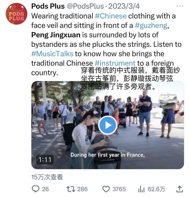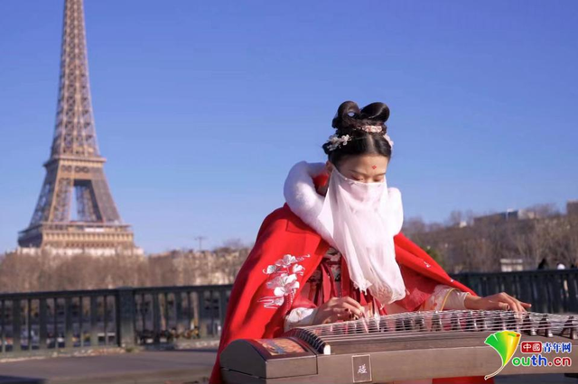 “95后”女孩彭静璇则自2018年开始,在埃菲尔铁塔、波尔多剧院等诸多法国地标建筑前,留下民乐器表演的身影。每次演出她都精心装扮,穿上中国传统服饰,用古筝在布满西洋建筑的街道奏响充满东方魅力的旋律。颤、按、滑、揉,江湖豪气,侠女风范,像极了武侠小说中弹着古琴闯荡江湖的女主角。