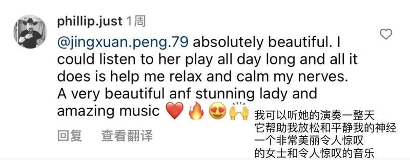 大家在YouTube上听完彭静旋的演奏,也纷纷在视频下留言:“这个小男孩和他妈妈都震惊了,并深深沉醉其中。”“穿汉服,演奏中国传统乐器,是我的目标。”……