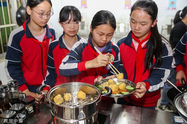 2023年4月11日,广西桂林,灵川县灵田镇中心校,劳动课老师带领学生们烹制当地特色美食。