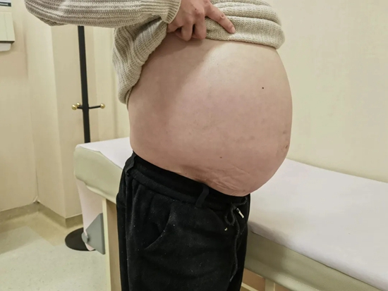 每个月排卵期前后,程小曼的肚子会像怀了三四个月的孕妇。每到那时,她就把自己和隆起的肚子藏到家里,穿上黑色的大码T恤。过了那两天,腹水会通过尿液排出,她要每隔10分钟上一次厕所。三四天后排完腹水,肚子又恢复正常。去年12月感染新冠病毒后,她的肚子越来越大。她开始走不动路,呼吸困难,很难说话。她的血氧饱和度曾低到60%,远低于正常基准95%。