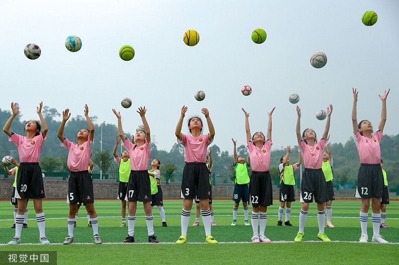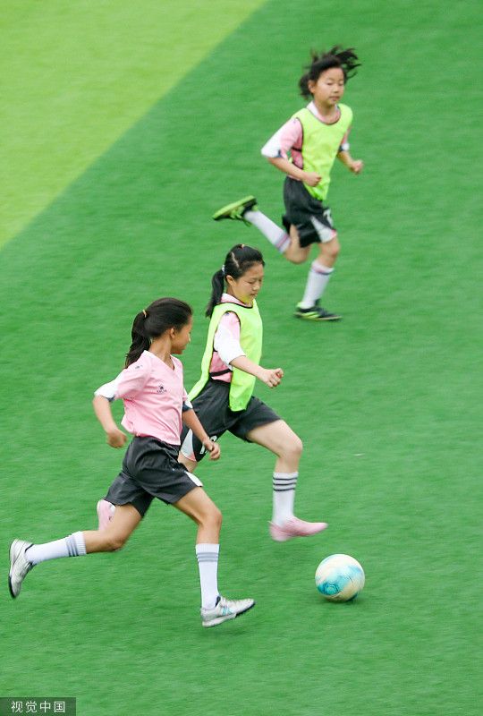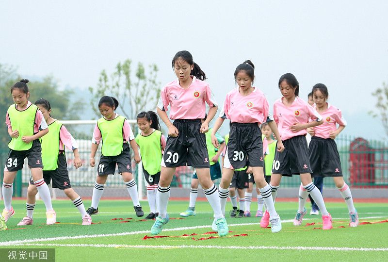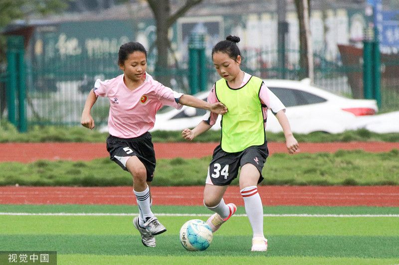 4月13日,四川华蓥,双河三小的女子足球队成员在绿茵场上参加实战训练。