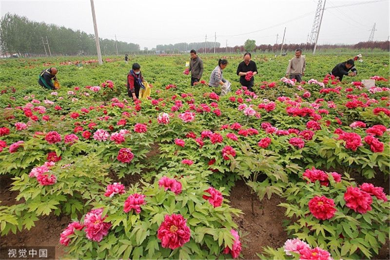 2023年4月14日,山东菏泽,花农田间采收牡丹,一派繁忙景象。