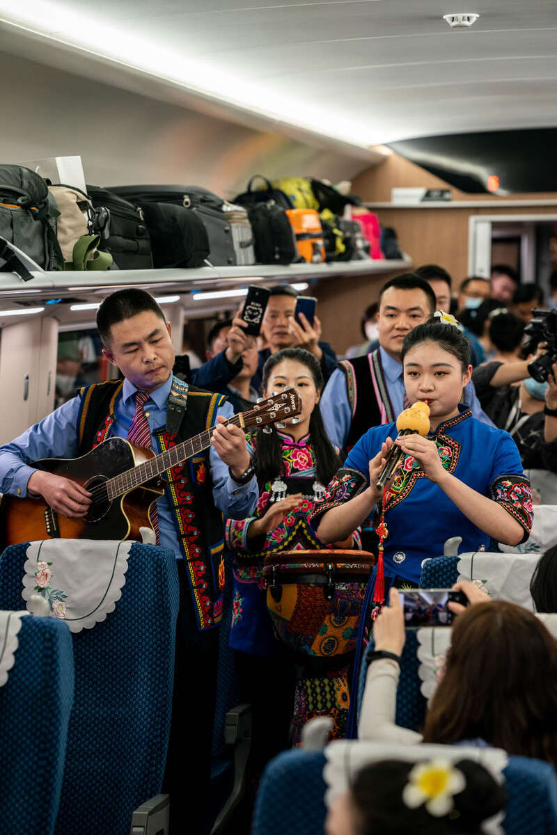 列车每组座椅下方设有中国和老挝标准电源插座,旅客信息显示、广播和服务标识均采用中、老、英三种语言。“中老铁路是时速160公里普速铁路的标杆工程,乘坐非常舒适。”中国铁路昆明局集团有限公司董事长王耕捷说,车内文化风情浓郁,眼中有花,窗外有绿,一站一景,乘坐列车呈现“人在车中坐、车在画中行”的景象。