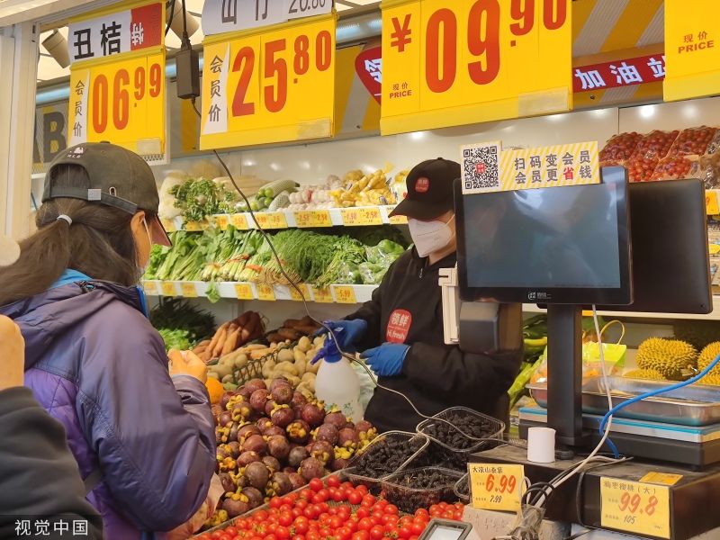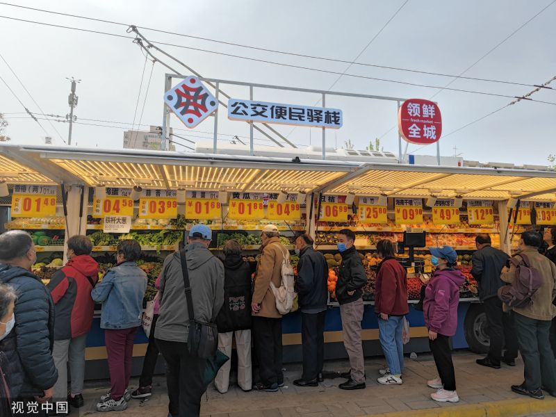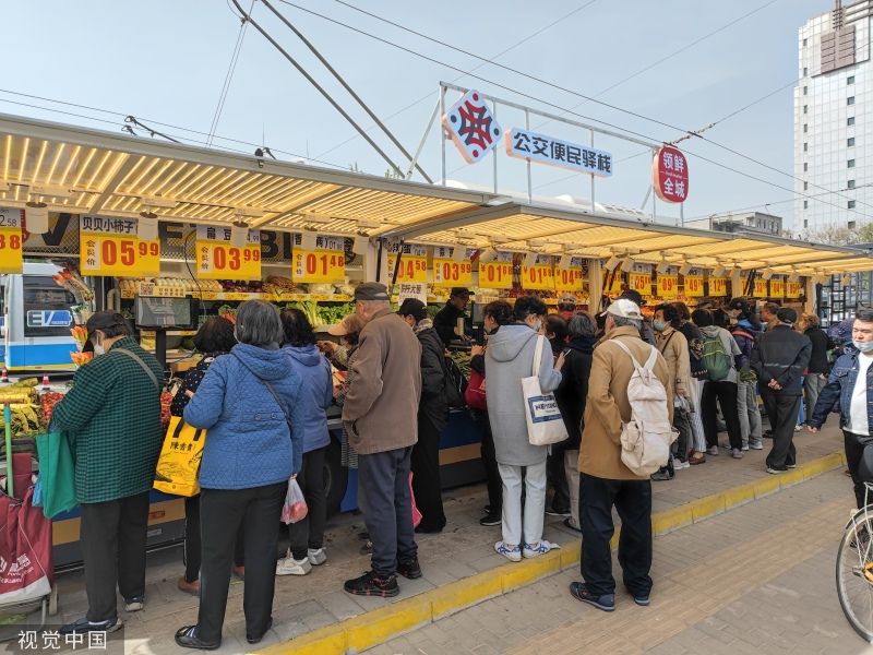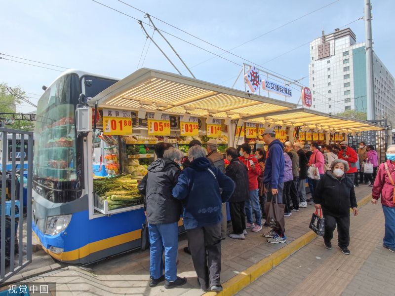 2023年4月12日,北京,朝阳区柳芳公交站外,市民在一辆由公交车改装的便民驿站购买蔬菜水果。公交便民驿站是北京公交集团和第三方企业合作开设的便民服务项目。