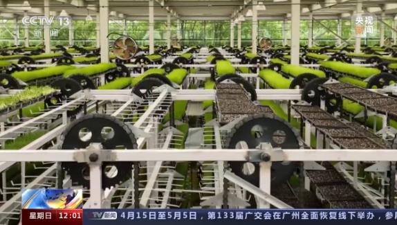 在安徽省芜湖市南陵县的智能育秧育苗中心,循环运动式育秧育苗机“火力全开”,集中排列在秧盘上的水稻秧苗随着传动链条的转动,可以从上到下循环变换位置, 既利用了空间,又享受到均匀的光照。