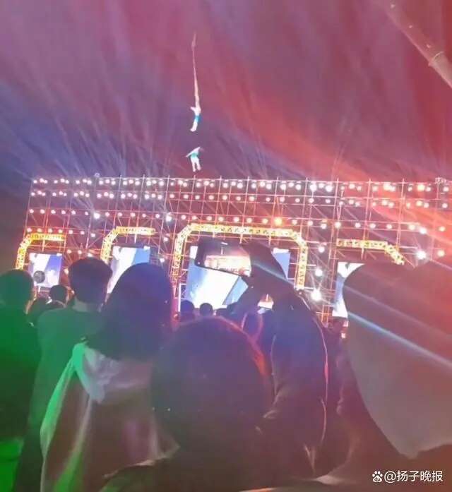 据多段网传视频显示,当时起重机吊起了两名杂技演员在空中做花式动作,处在下方的女演员疑似在表演过程中突然脱手重重坠落到舞台上,现场主持人一直在呼吁观众主动挪车为120急救车让路。最后还是由在现场维持秩序的宿州蓝天救援队工作人员将受伤女演员抬到演出场地外围的救护车上。