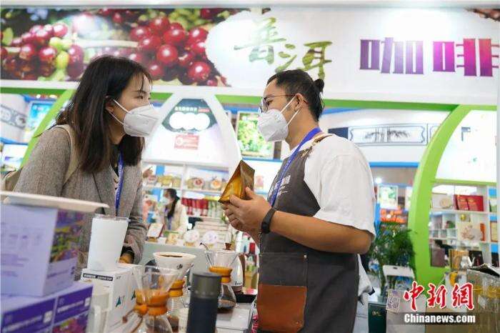 咖啡师向参观者介绍普洱咖啡。刘冉阳 摄