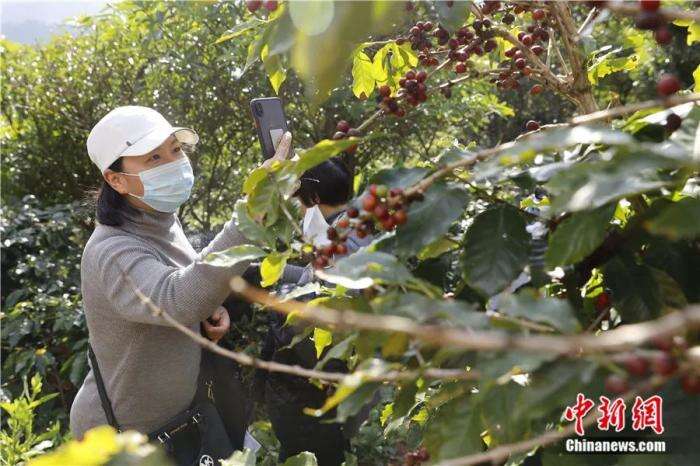 云南省普洱市的一处咖啡庄园内,游客拍摄新鲜咖啡树果实。李嘉娴 摄