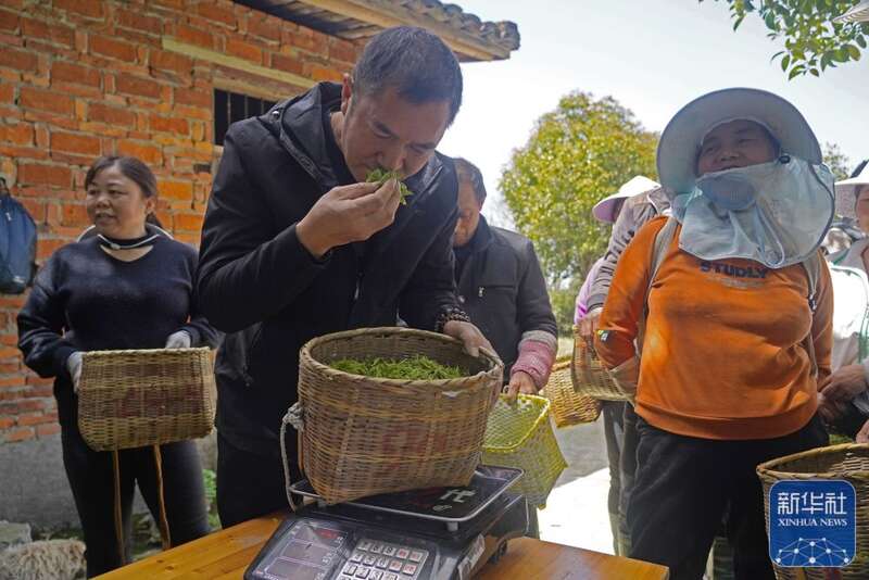 刘煌平(左二)在港背村的茶园里收购刚刚采摘的春茶(4月7日摄)。新华社记者 万象 摄