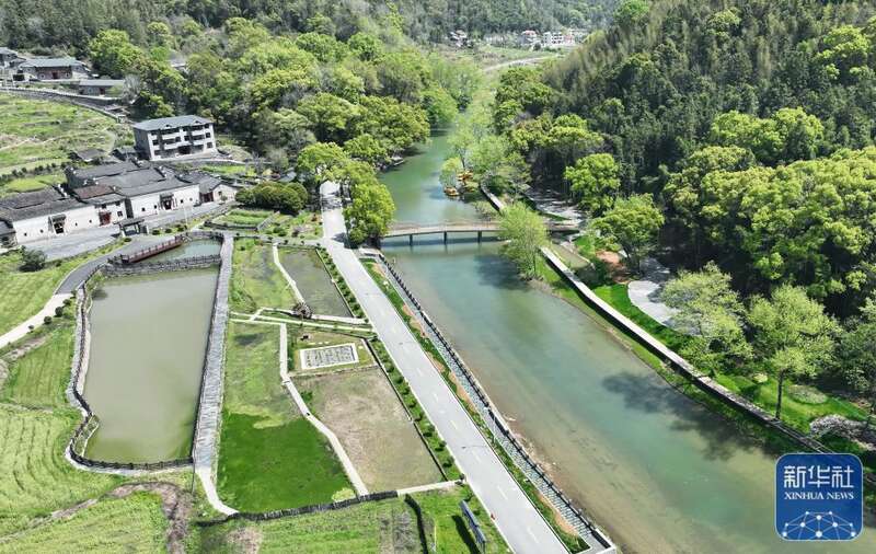 九岭山环抱中的港背村(4月7日摄,无人机照片)。新华社记者 万象 摄