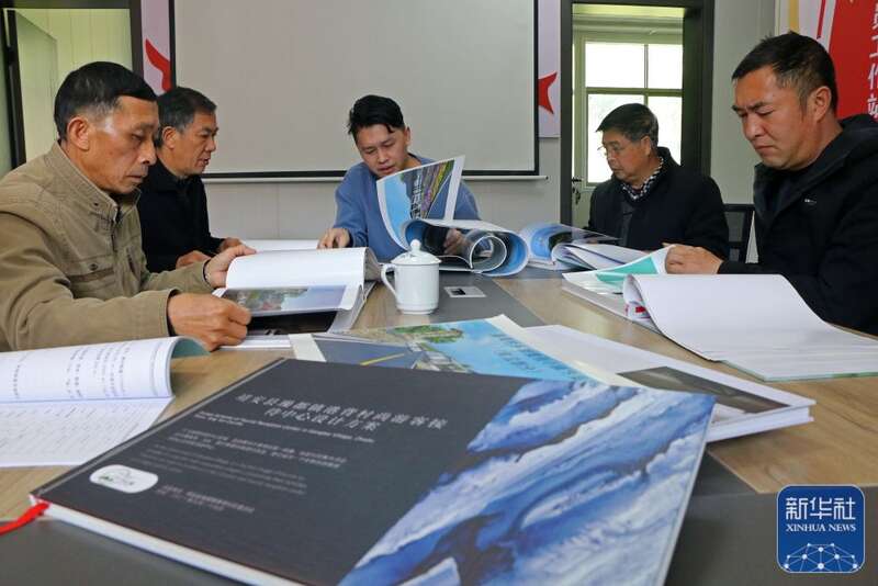 包希孟(中)和公司成员一起讨论旅游项目的设计方案(4月7日摄)。新华社记者 王奕涵 摄