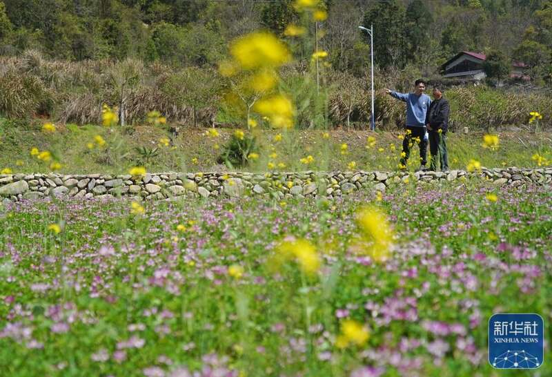 包希孟(左)与村民商量一片花田的规划(4月7日摄)。新华社记者 万象 摄