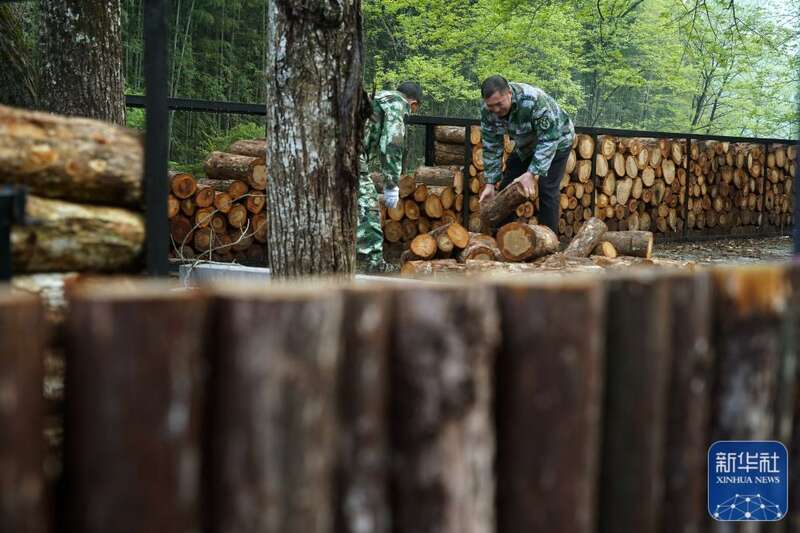 村民刘煌平(右)用木头搭建旅游步道的护栏(4月6日摄)。新华社记者 万象 摄