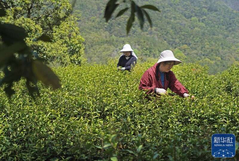 村民在港背村的茶园里采摘春茶(4月7日摄)。新华社记者 万象 摄
