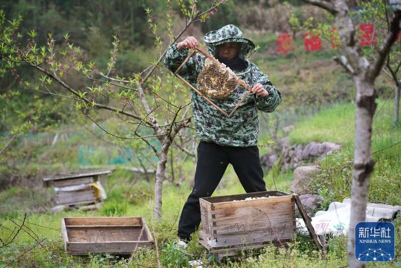 村党支部书记吴竹林在查看蜂箱(4月6日摄)。新华社记者 万象 摄