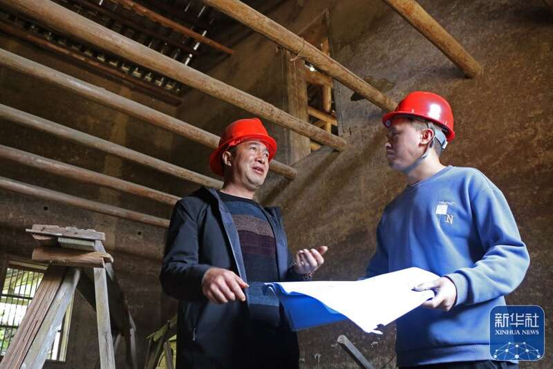 在一处荒废的老屋内,包希孟(右)与刘煌平讨论改建民宿的设计方案(4月7日摄)。新华社记者 王奕涵 摄
