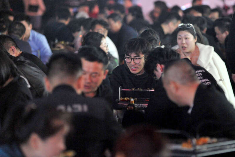 4月14日晚,淄博烧烤摊,众人正在吃烧烤。(新华社发 刘一鸣摄)