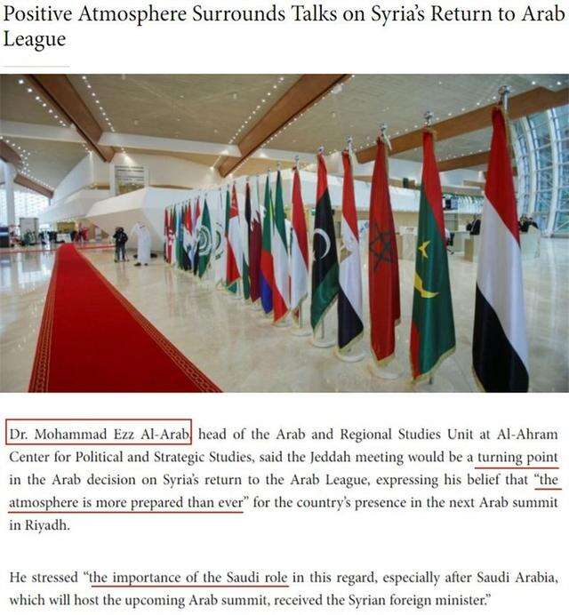 沙特《中东报》援引埃及阿赫拉姆政治和战略研究中心(ACPSS)专家穆罕默德·埃兹·阿拉伯的话说,吉达会议是阿拉伯国家决定重新接纳叙利亚的转折点,“气氛比以往任何时候都更积极”。