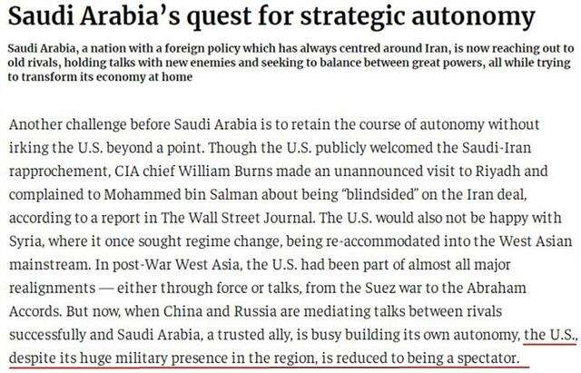 有媒体指出,二战结束后,中东几乎所有重大变局背后都有美国的参与。但随着以前互为对手的中东国家纷纷缓和关系,以及盟友沙特加紧追求战略自主,美国虽然在该地区仍有庞大的军事存在,但却已经沦为了一个旁观者。