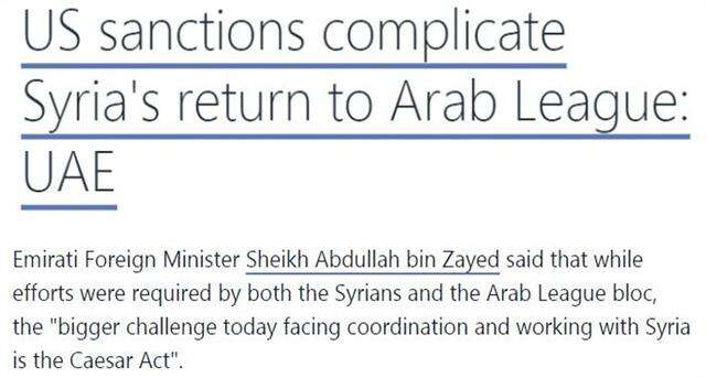 对此,率先与叙利亚改善了关系的阿联酋早就直言,美国的制裁使叙利亚重返阿盟变得复杂,因为美国一直在阻挠饱受战火摧残的叙利亚“恢复正常”。