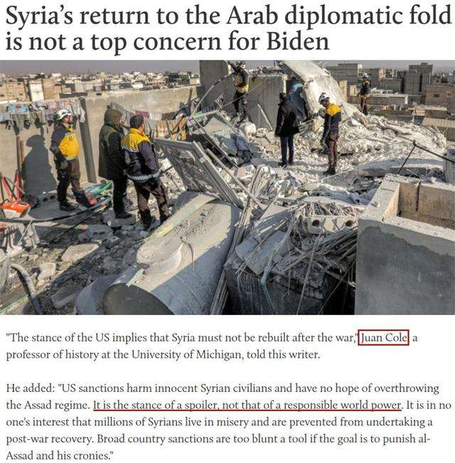 报道援引密歇根大学历史教授胡安·科尔的话指出,美国的目的就是阻挠叙利亚在战后开展重建,“这是一个破坏者的立场,而不是一个负责任大国的立场”。
